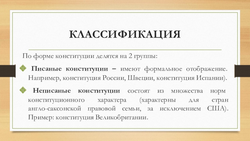 имеют формальное отображение. Например, конституция России, Швеции, конституция Испании).