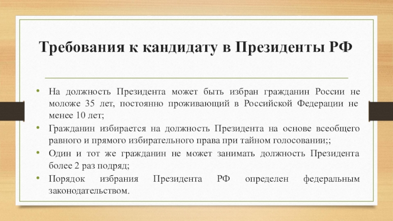 гражданин России не моложе 35 лет, постоянно проживающий в Российской Федерации не менее 10 лет;