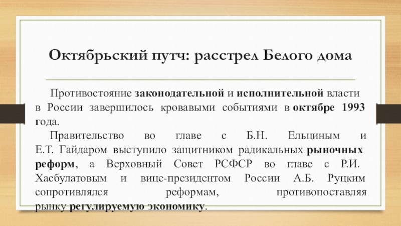 Е.Т. Гайдаром выступило защитником радикальных рыночных реформ, а Верховный Совет РСФСР во главе с Р.И. Хасбулатовым и вице-президентом России А.Б. Руцким сопротивлялся реформам, противопоставляя рынку регулируемую экономику.