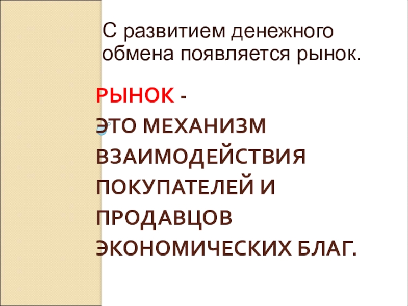 РЫНОК -  ЭТО МЕХАНИЗМ ВЗАИМОДЕЙСТВИЯ ПОКУПАТЕЛЕЙ И ПРОДАВЦОВ ЭКОНОМИЧЕСКИХ БЛАГ.С развитием денежного обмена появляется рынок.