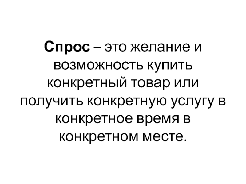 Спрос – это желание и возможность купить конкретный товар или получить конкретную услугу в конкретное время в
