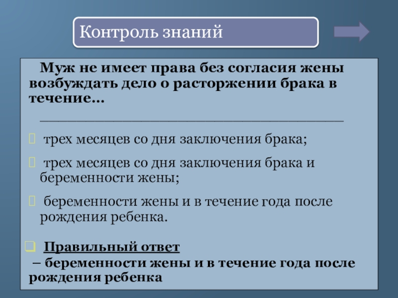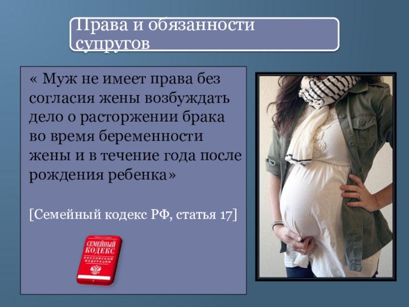 Слайд 35Муж не имеет права без согласия жены возбуждать дело о расторжении