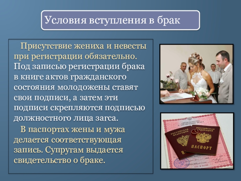 Слайд 16Присутствие жениха и невесты при регистрации обязательно. Под записью регистрации брака