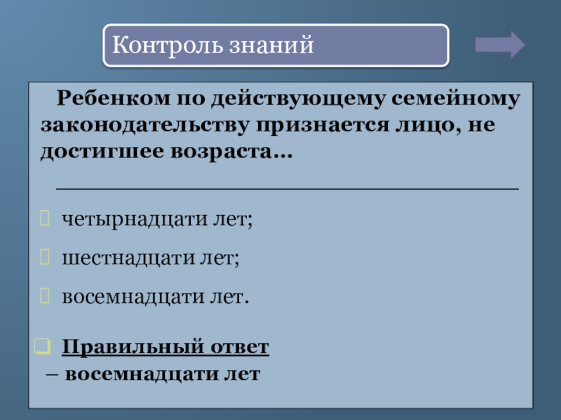 Слайд 36Ребенком по действующему семейному законодательству признается лицо, не достигшее возраста…