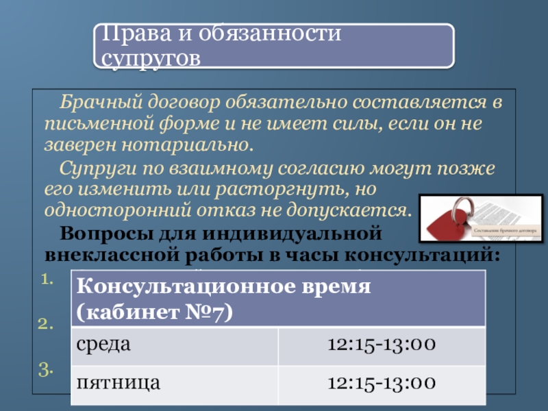 Слайд 21Брачный договор обязательно составляется в письменной форме и не имеет силы,