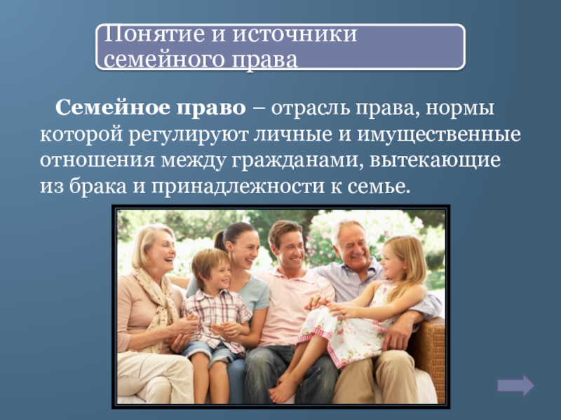 Слайд 4Семейное право – отрасль права, нормы которой регулируют личные и имущественные
