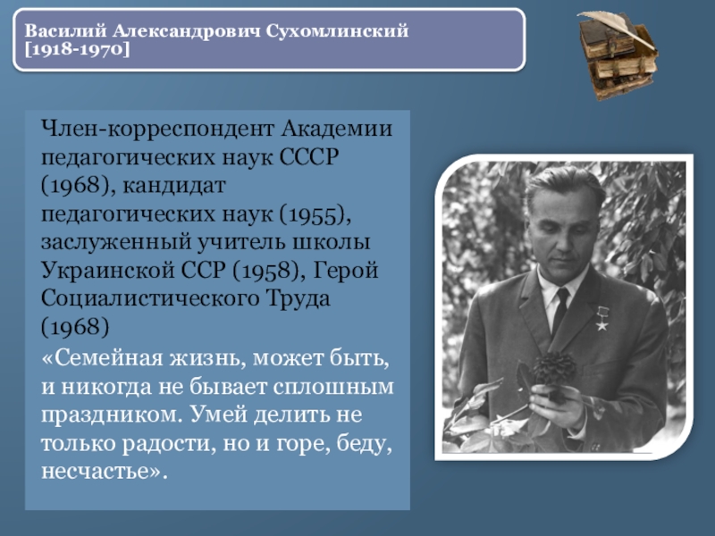 Слайд 41Член-корреспондент Академии педагогических наук СССР (1968), кандидат педагогических наук (1955), заслуженный