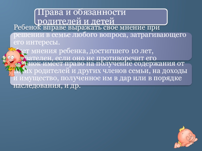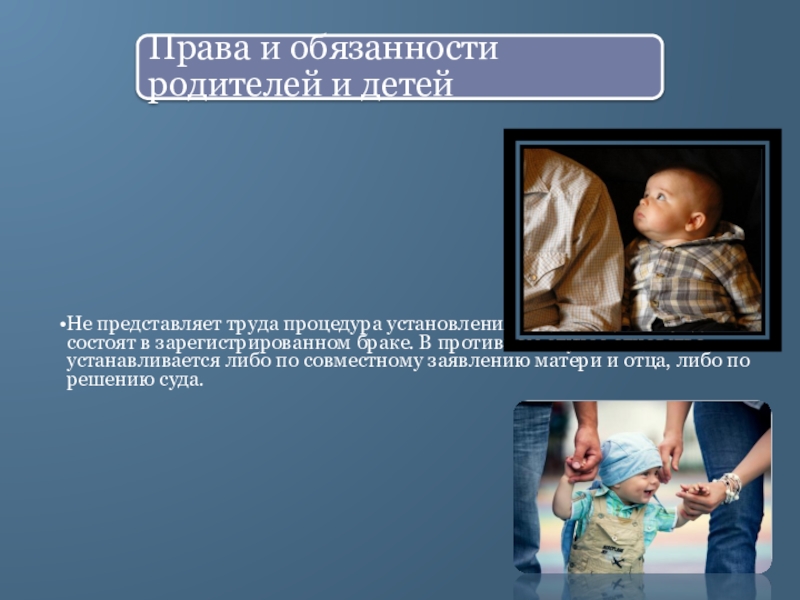 Слайд 24Юридическим основанием личных и имущественных отношений между родителями и детьми является
