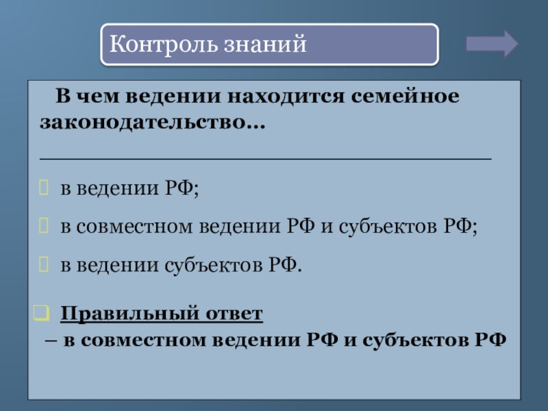 Слайд 6В соответствии с Конституцией РФ семейное законодательство находится в совместном ведении