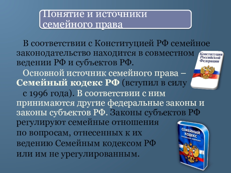 с 1996 года). В соответствии с ним принимаются другие федеральные законы и законы субъектов РФ. Законы субъектов РФ регулируют семейные отношения