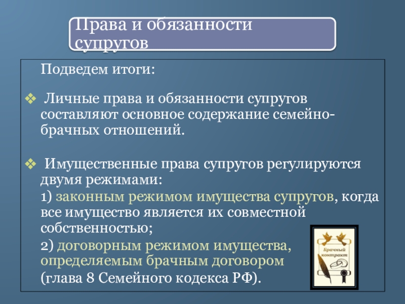 Личные права и обязанности супругов составляют основное содержание семейно-брачных