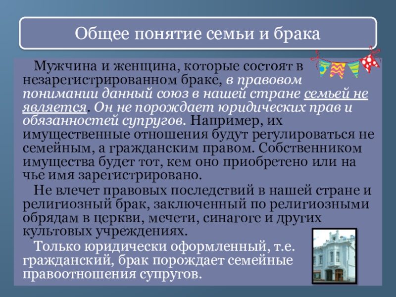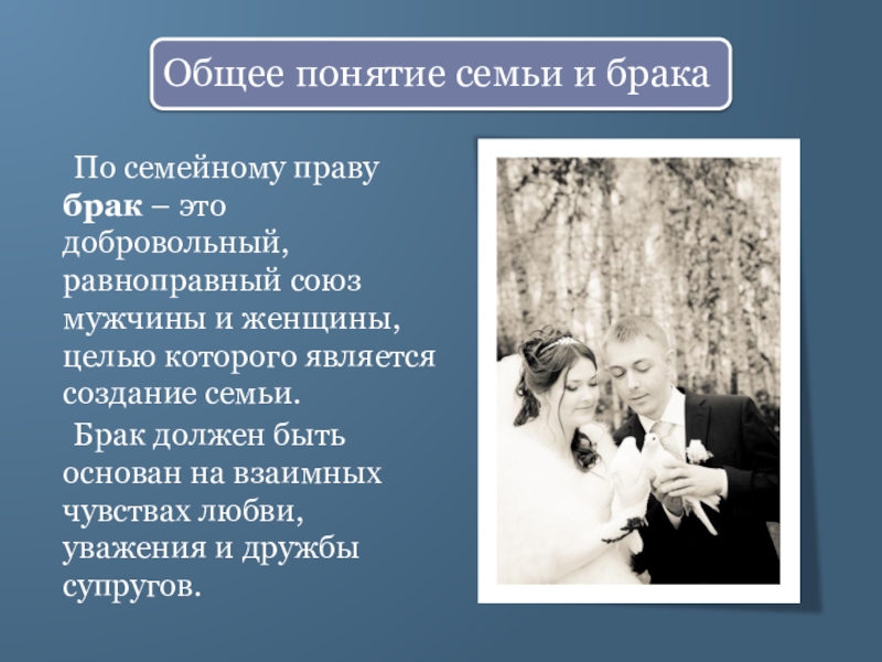 Слайд 9По семейному праву брак – это добровольный, равноправный союз мужчины и