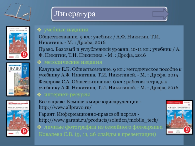 Калуцкая Е.К. Обществознание. 9 кл.: методическое пособие к учебнику А.Ф. Никитина, Т.И. Никитиной. - М. : Дрофа, 2015