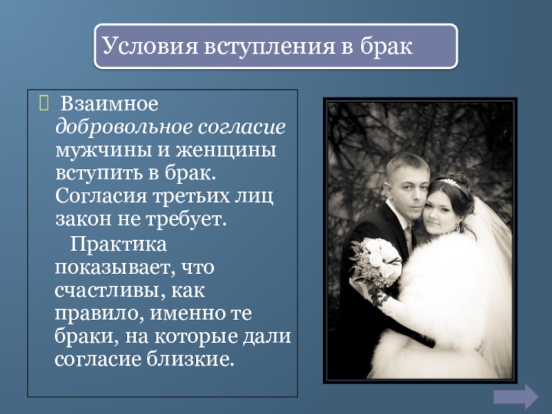 Слайд 11 Взаимное добровольное согласие мужчины и женщины вступить в брак. Согласия