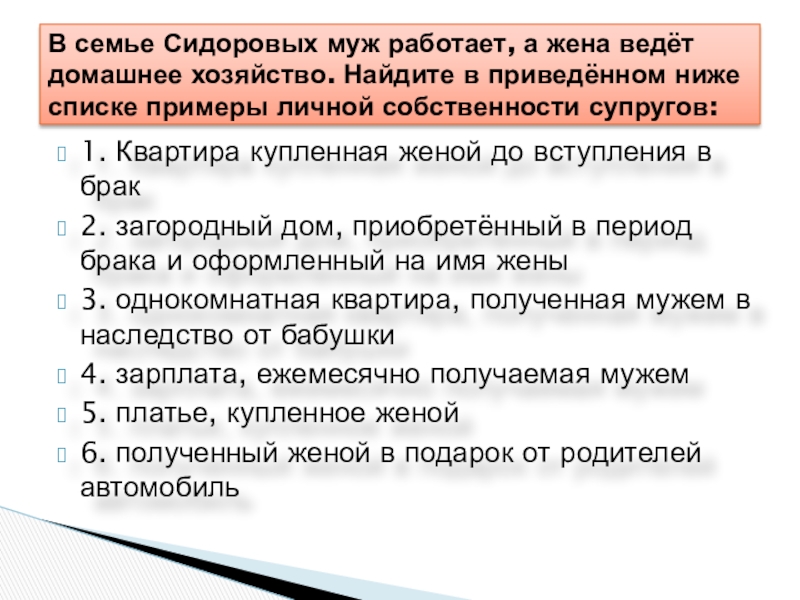 В семье Сидоровых муж работает, а жена ведёт домашнее хозяйство. Найдите в приведённом ниже списке примеры личной собственности супругов: