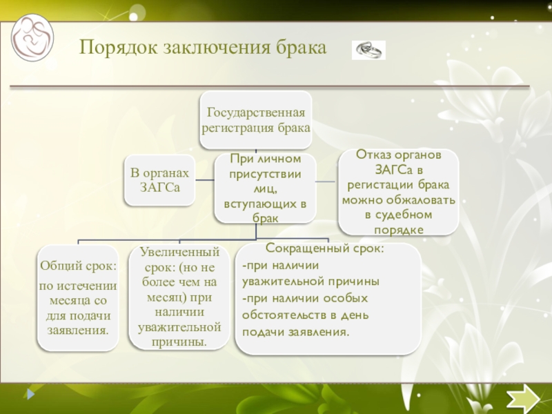 Порядок заключения брака   Сокращенный срок:-при наличии уважительной причины-при наличии особых обстоятельств в день подачи заявления.