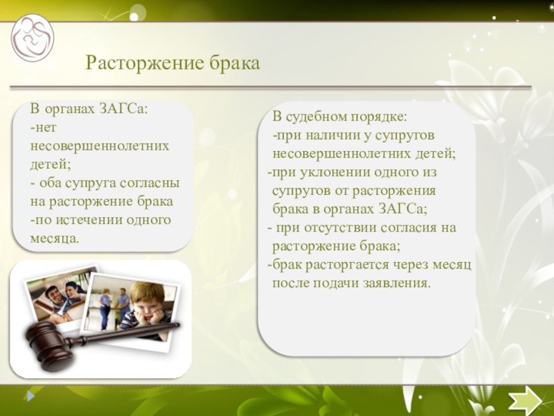 Расторжение бракаВ органах ЗАГСа:-нет несовершеннолетних детей;- оба супруга согласны на расторжение брака-по истечении одного месяца.В судебном порядке:-при