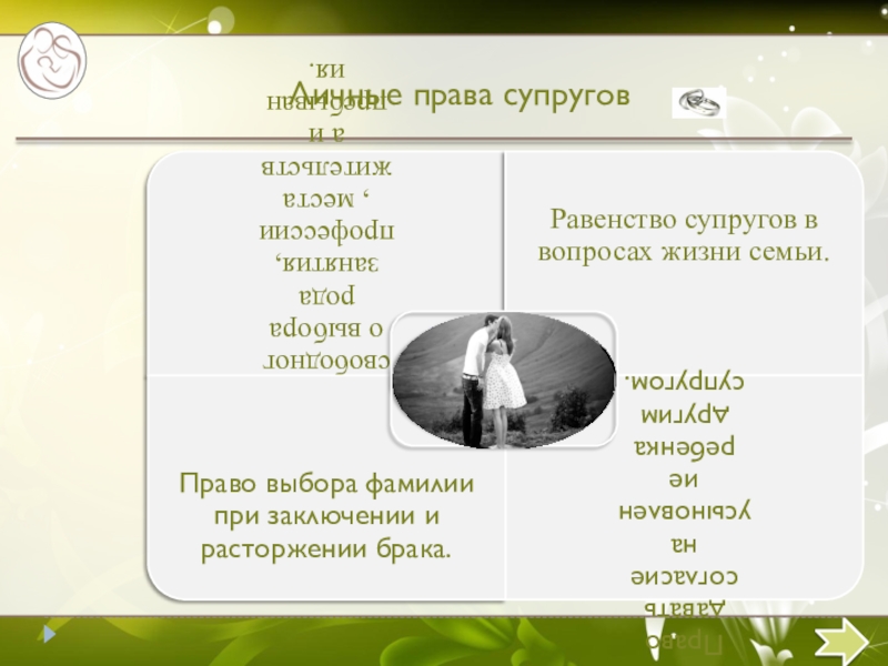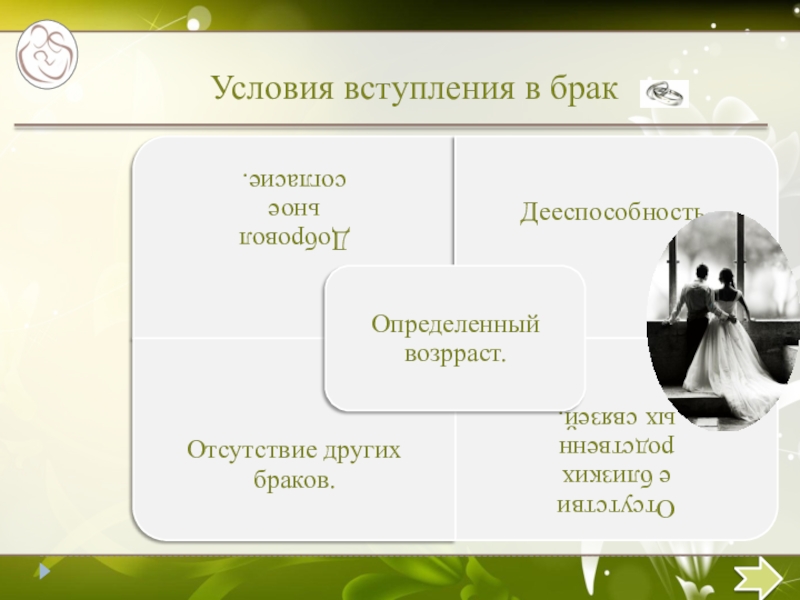 Брачный договорТекст слайдаЗаключается:-до государственной регистрации брака;в период брака.Вступает в силу:с момента заключения договора; с момента регистрации брака.Обязательная