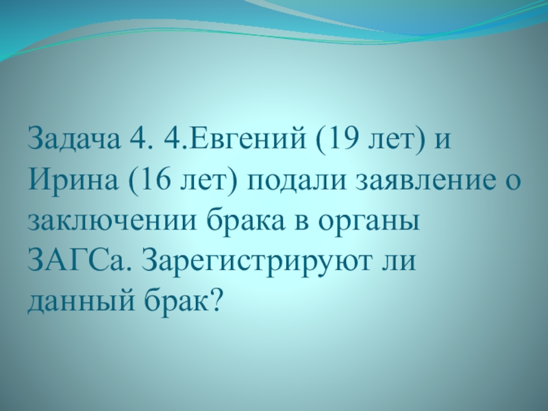 Задача 4. 4.Евгений (19 лет) и Ирина (16 лет) подали заявление о заключении брака в
