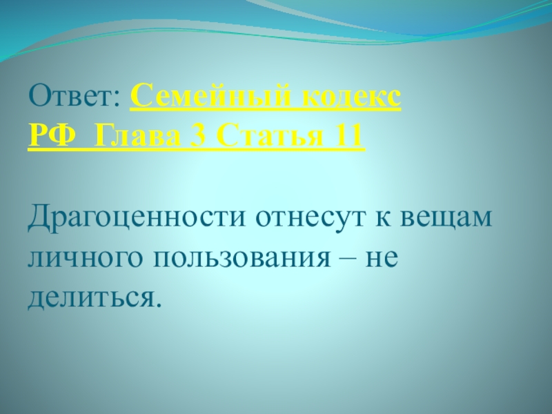 Слайд 14Ответ: Семейный кодекс РФ  Глава 3 Статья 11 Драгоценности отнесут к вещам личного