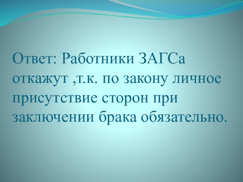 Слайд 22Ответ: Работники ЗАГСа откажут ,т.к. по закону личное присутствие сторон при заключении