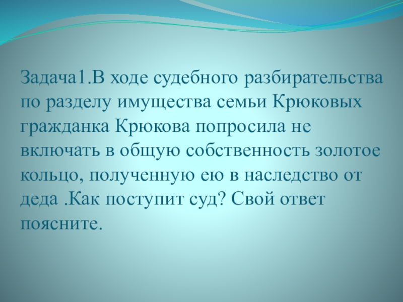 Слайд 13Задача1.В ходе судебного разбирательства по разделу имущества семьи Крюковых гражданка Крюкова
