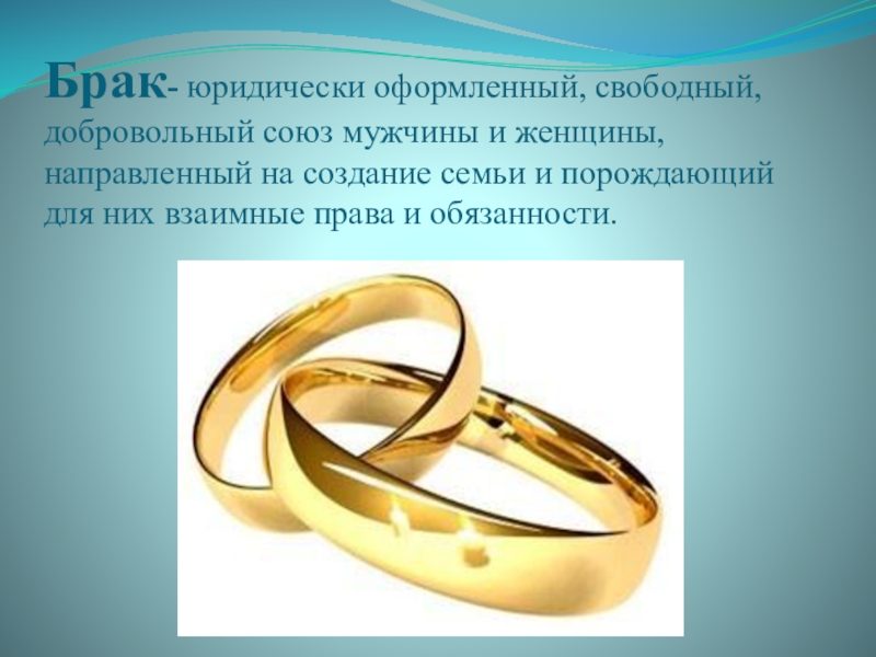 Слайд 5Брак- юридически оформленный, свободный, добровольный союз мужчины и женщины, направленный на