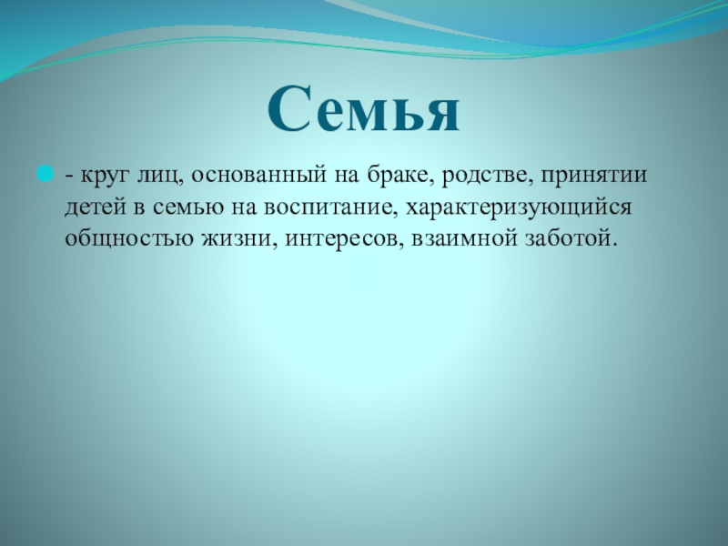 Семья- круг лиц, основанный на браке, родстве, принятии детей в семью на воспитание, характеризующийся общностью жизни, интересов,