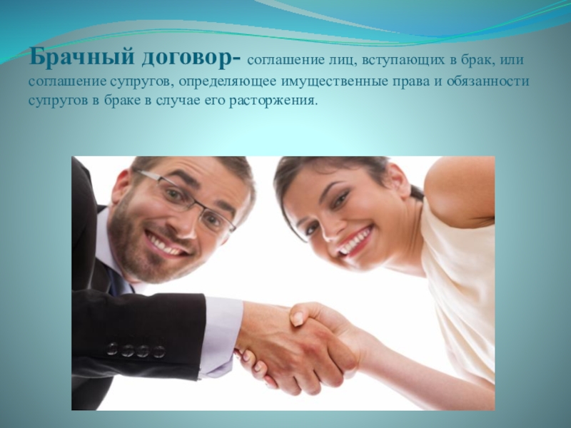 Слайд 10 Брачный договор- соглашение лиц, вступающих в брак, или соглашение супругов, определяющее