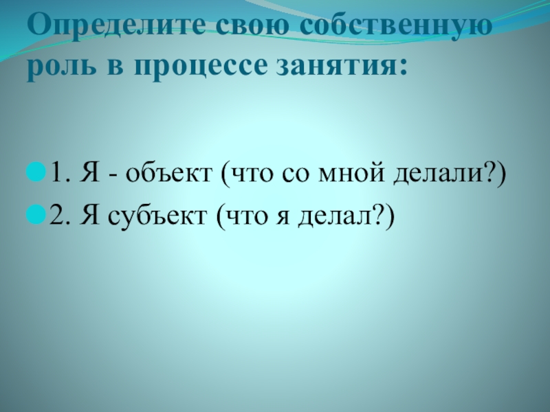 Определите свою собственную роль в процессе занятия:  1. Я - объект (что со мной делали?)2. Я