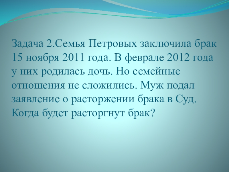 Слайд 15Задача 2.Семья Петровых заключила брак 15 ноября 2011 года. В феврале
