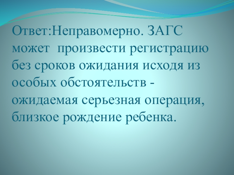 Слайд 18 Ответ:Неправомерно. ЗАГС  может  произвести регистрацию без сроков ожидания исходя из особых