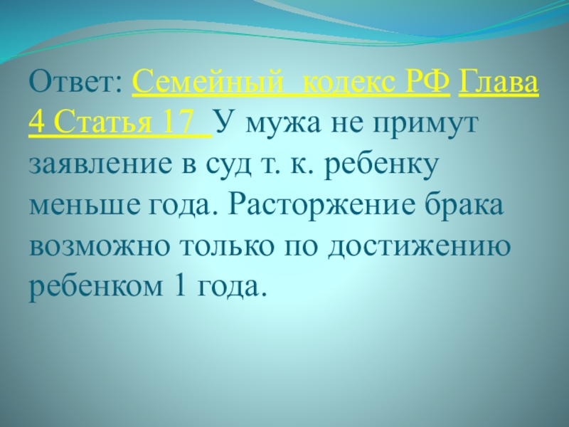 Слайд 16Ответ: Семейный кодекс РФ Глава 4 Статья 17 У мужа не