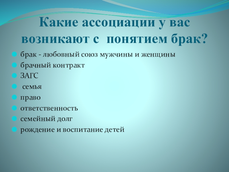 Слайд 3Какие ассоциации у вас возникают с понятием брак?
