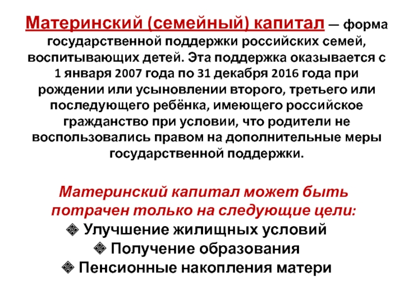 Слайд 22Материнский (семейный) капитал — форма государственной поддержки российских семей, воспитывающих детей. Эта