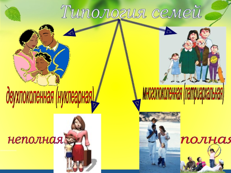 Типология семей двухпоколенная (нуклеарная) многопоколенная (патриархальная) полная неполная