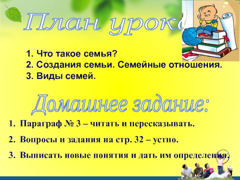 План урока:  1. Что такое семья?  2. Создания семьи. Семейные отношения.  3. Виды семей.Домашнее