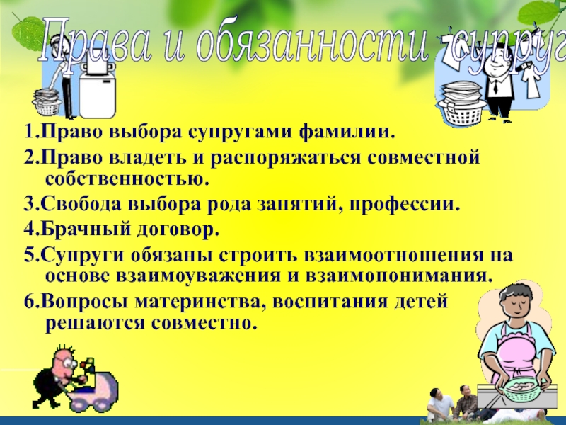 1.Право выбора супругами фамилии.2.Право владеть и распоряжаться совместной собственностью.3.Свобода выбора рода занятий, профессии.4.Брачный договор.5.Супруги обязаны строить взаимоотношения