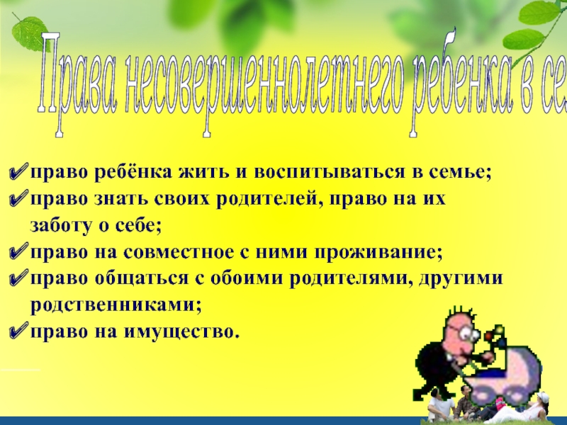 Права несовершеннолетнего ребенка в семье право ребёнка жить и воспитываться в семье;право знать своих родителей, право на