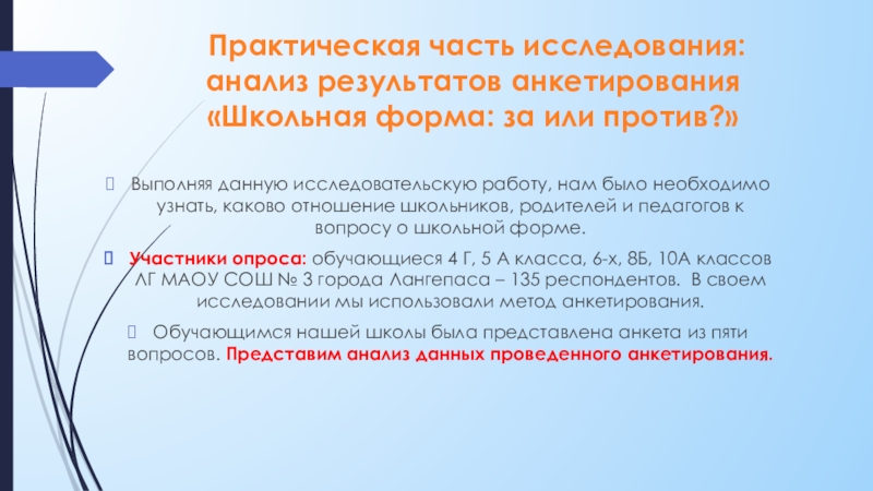 Выполняя данную исследовательскую работу, нам было необходимо узнать, каково отношение школьников, родителей и педагогов к вопросу о школьной форме.