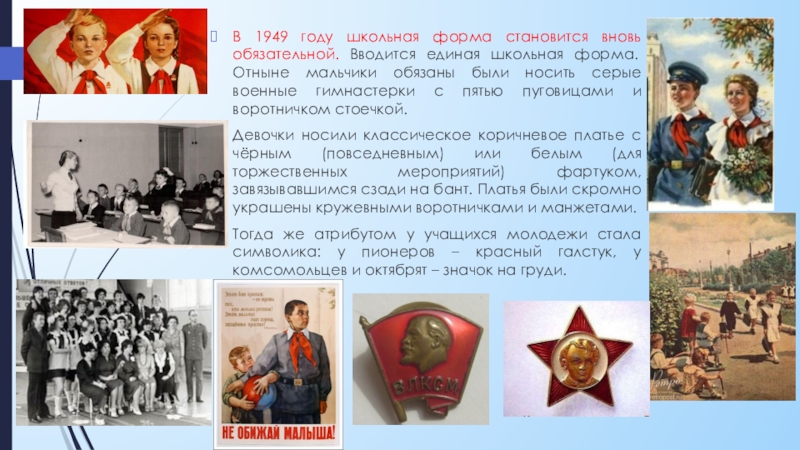 Слайд 8В 1949 году школьная форма становится вновь обязательной. Вводится единая школьная