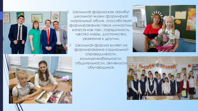 Слайд 22Школьная форма как атрибут школьной жизни формирует моральный облик, способствует формированию
