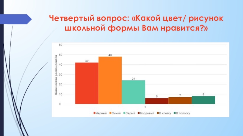 Слайд 16Четвертый вопрос: «Какой цвет/ рисунок школьной формы Вам нравится?»