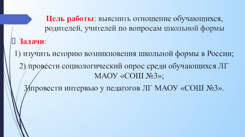 Слайд 3Цель работы: выяснить отношение обучающихся, родителей, учителей по вопросам школьной формы