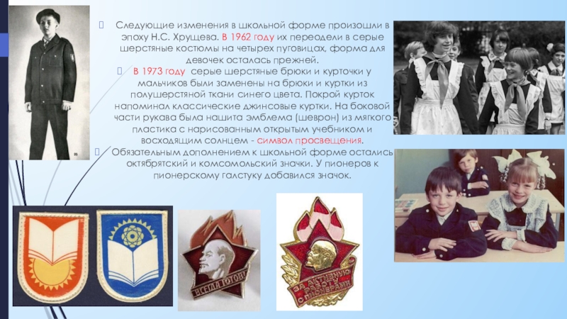 Слайд 9Следующие изменения в школьной форме произошли в эпоху Н.С. Хрущева. В