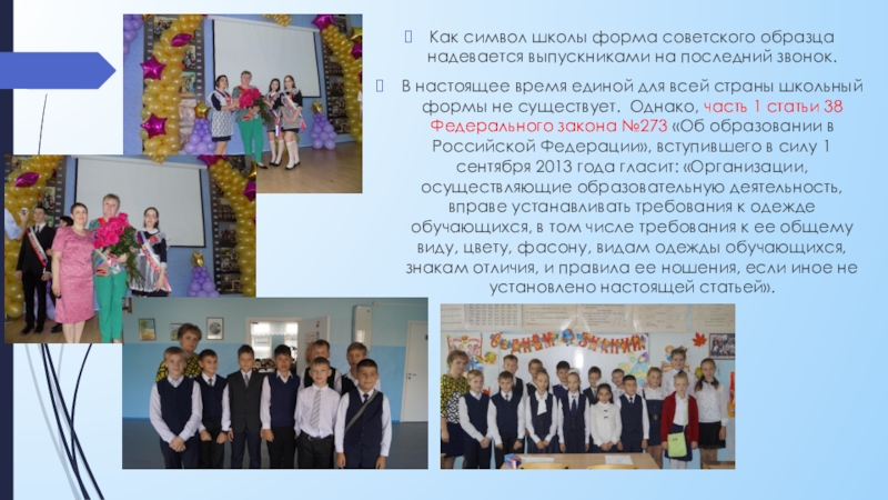 Слайд 11Как символ школы форма советского образца надевается выпускниками на последний звонок.