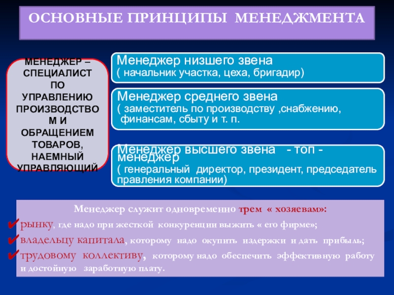 « диктатом», будучи зависимыми от профессионалов. Характерно, что менеджер чаще всего не является владельцем фирмы, выступает в роли наемного работника.