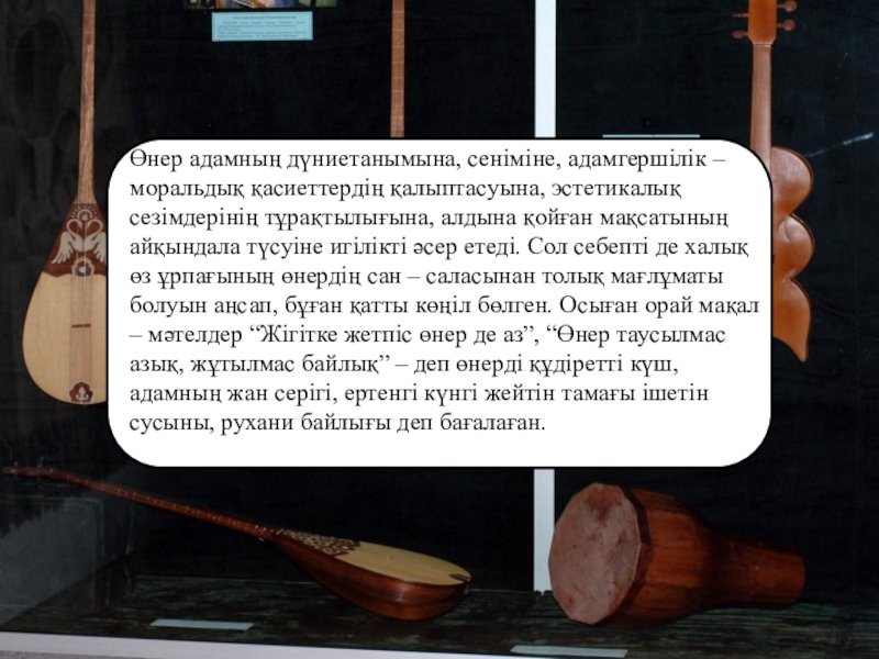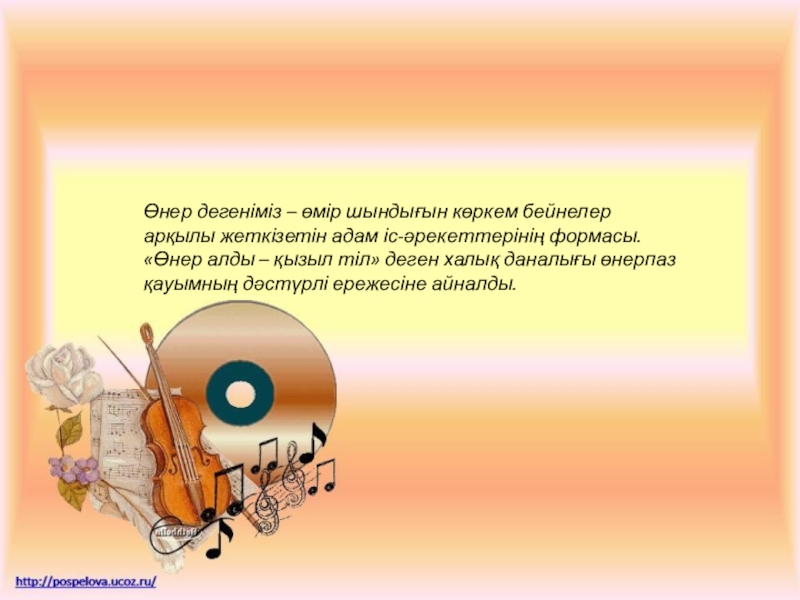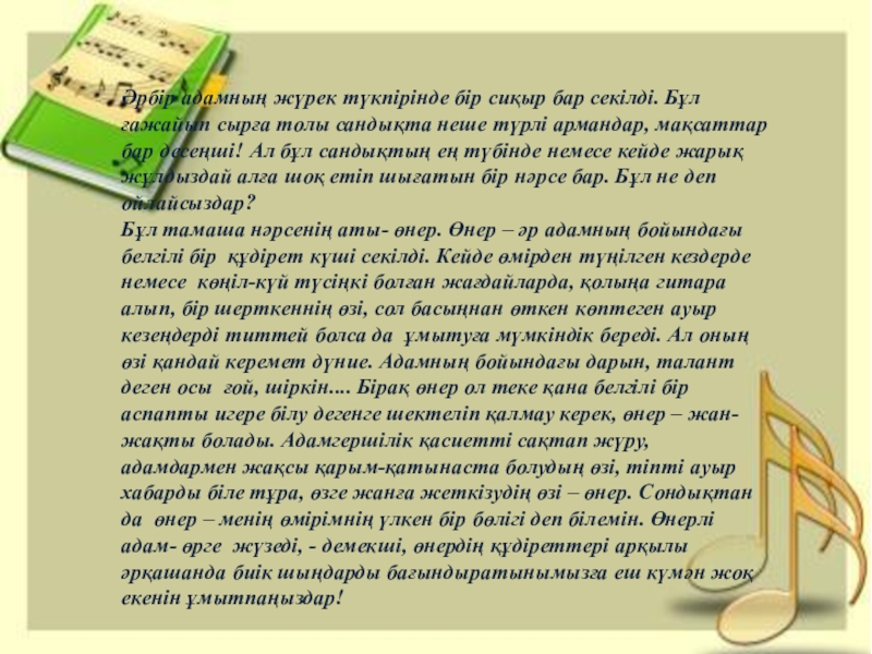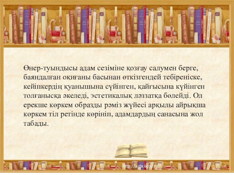 Өнер-туындысы адам сезіміне қозғау салумен берге, баяндалған оқиғаны басынан өткізгендей тебіреніске, кейіпкердің қуанышына сүйінген, қайғысына күйінген толғанысқа әкеледі, эстетикалық ләззатқа бөлейді. Ол ерекше көркем образды рәміз жүйесі арқылы айрықша көркем тіл ретінде көрініп, адамдардың санасына жол табады.