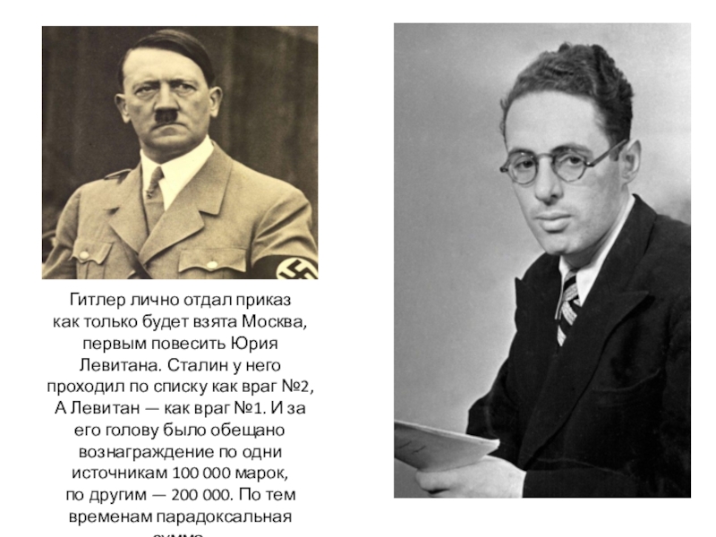 Левитана. Сталин у него проходил по списку как враг №2, А Левитан — как враг №1. И за его голову было обещано вознаграждение по одни источникам 100 000 марок, по другим — 200 000. По тем временам парадоксальная сумма.