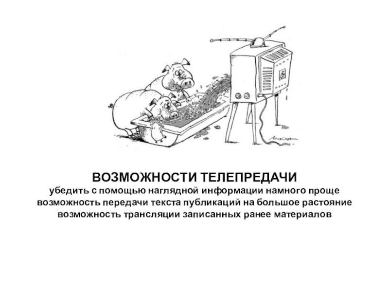 ВОЗМОЖНОСТИ ТЕЛЕПРЕДАЧИ убедить с помощью наглядной информации намного прощевозможность передачи текста публикаций на большое растояниевозможность трансляции записанных